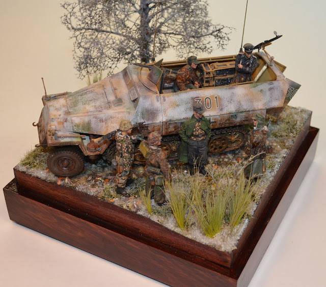 Revised finish on my Sd.kfz 251/3 and place in a small vignette with some figures and extensive groundwork and tree.